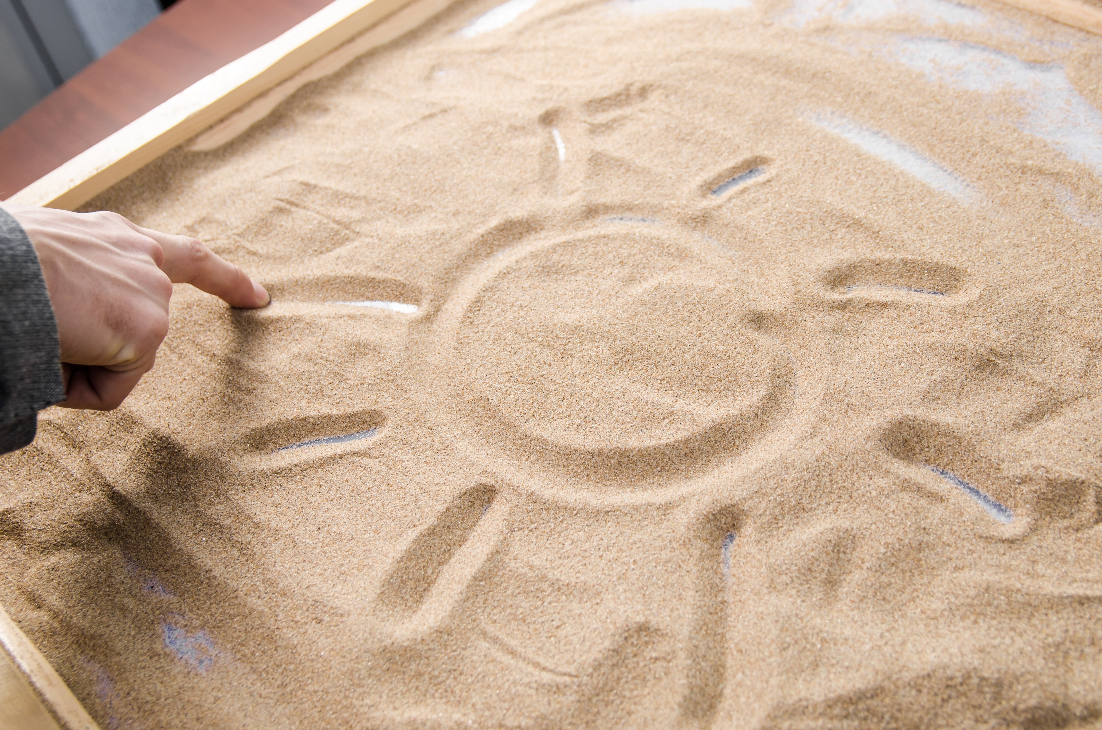 - Терапия с песком. Клиент создает в песке сюжет, картинку или образ, отражающий чувства, ситуацию или внутреннее состояние. Психолог наблюдает, не оценивает и не вмешивается. Может поддержать, если нужно.