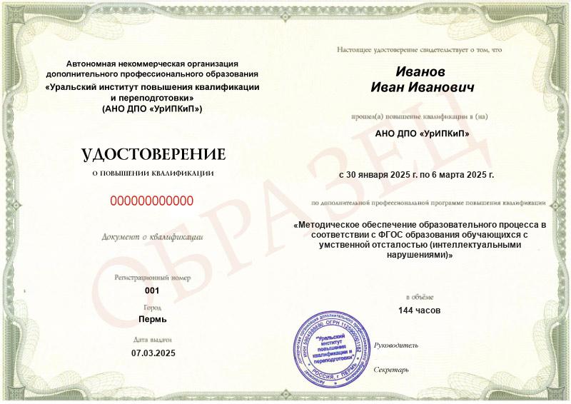 - Образец удостоверения о повышении квалификации.