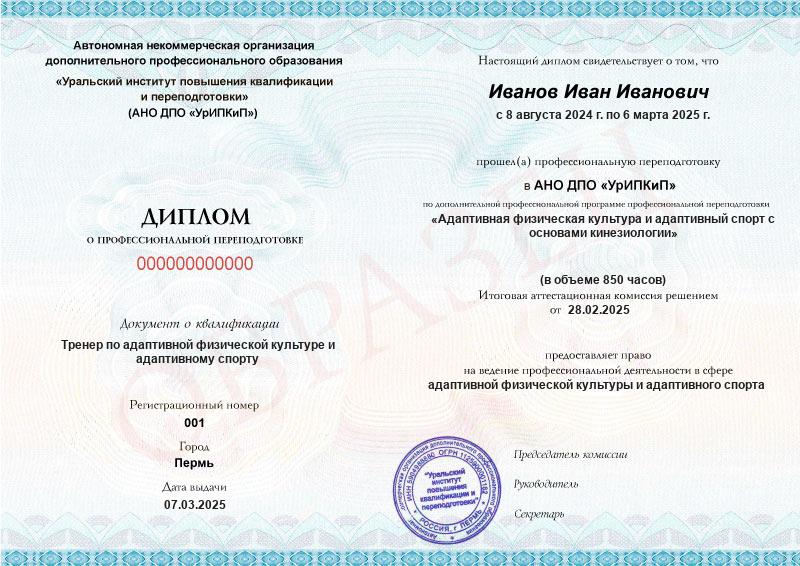 - Квалификация: Тренер по адаптивной физической культуре и адаптивному спорту