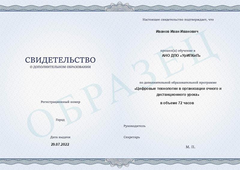 Заполненные образцы выдаваемых документов есть в описании учебных курсов и на странице «Лицензия. Документы», а также на главной странице официального сайта АНО ДПО «УрИПКиП».