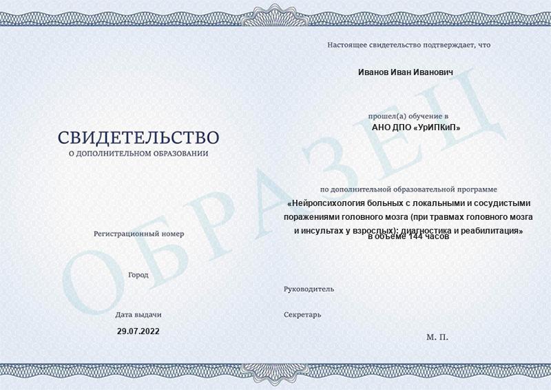 Нейропсихология больных с локальными и сосудистыми поражениями головного мозга (при травмах головного мозга и инсультах у взрослых): диагностика и реабилитация (144ч)
