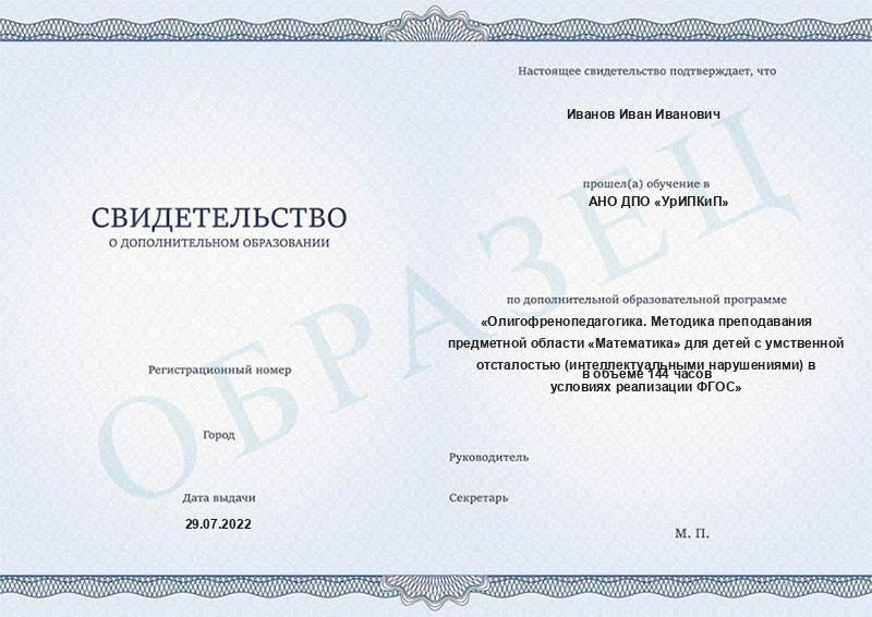Олигофренопедагогика. Методика преподавания предметной области «Математика» для детей с умственной отсталостью (интеллектуальными нарушениями) в условиях реализации ФГОС (144ч)