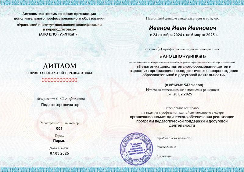 Да, дипломы и удостоверения оформляются в соответствии с действующим законодательством РФ. Документы печатаются на специальных бланках, заверяются печатью АНО ДПО «УрИПКиП».