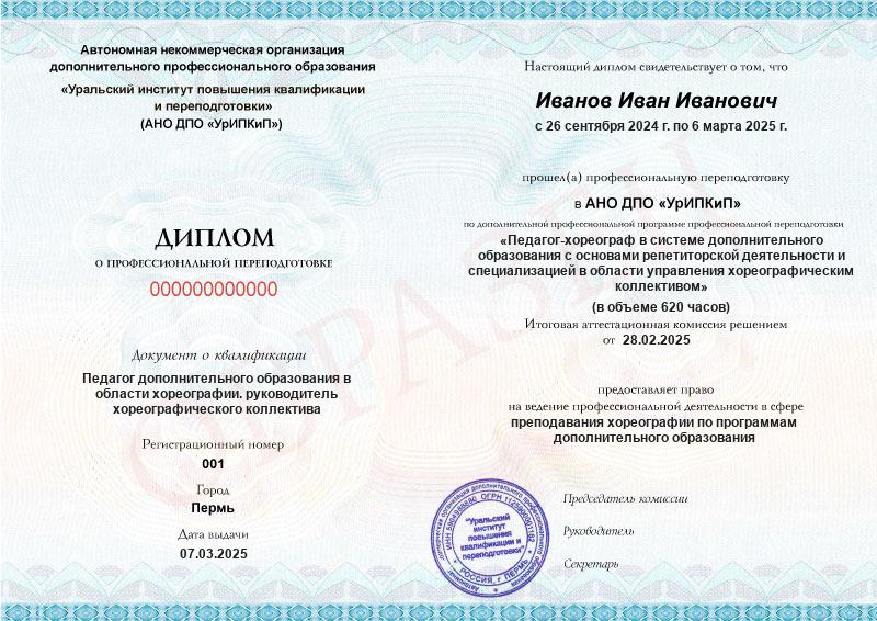 Педагог-хореограф в системе дополнительного образования с основами репетиторской деятельности и специализацией в области управления хореографическим коллективом (620ч)