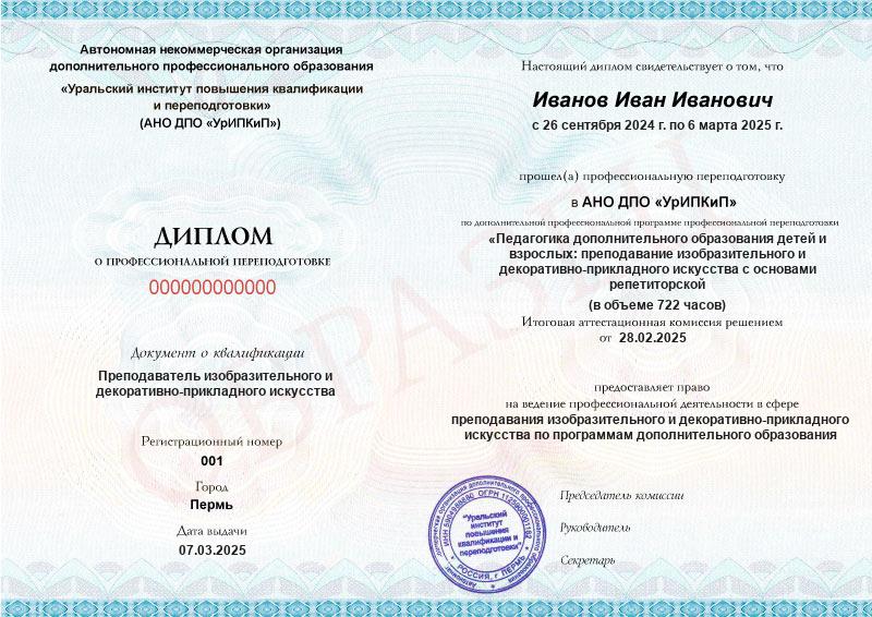 - 2 квалификации: Преподаватель изобразительного и декоративно-прикладного искусства + Репетитор по изобразительному и декоративно-прикладному искусству