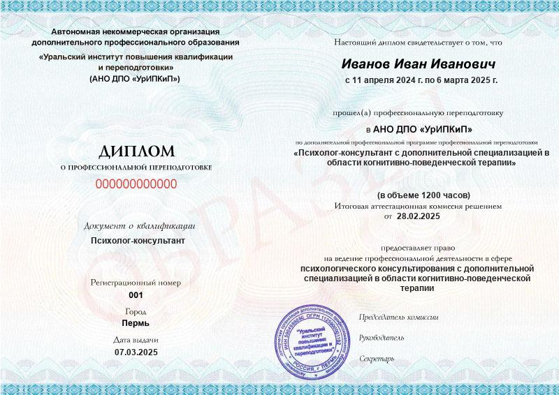 Курс обучения Психолог-консультант с дополнительной специализацией в области когнитивно-поведенческой терапии (1200ч)