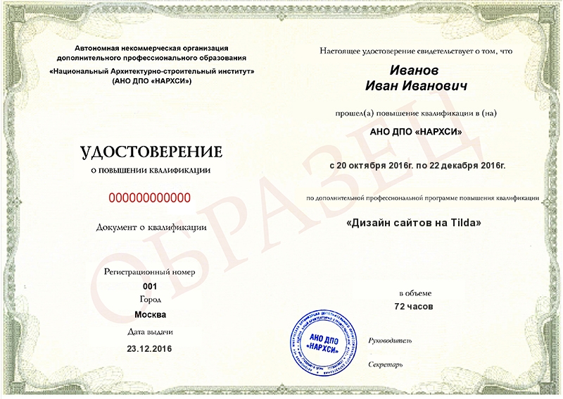 - Образец удостоверения о повышении квалификации.