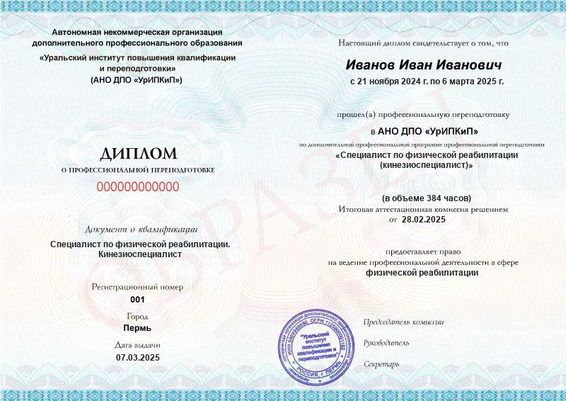 - Квалификация: Специалист по физической реабилитации. Кинезиоспециалист